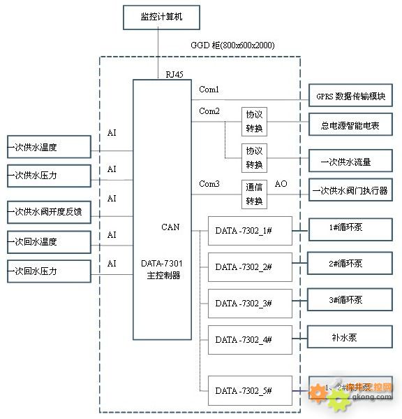 4.2 監(jiān)控終端系統(tǒng)構(gòu)成描述 監(jiān)控終端系統(tǒng)主要由值班室監(jiān)控終端柜和深井泵監(jiān)控終端箱組成。 值班室監(jiān)控終端中DATA-7301主要負(fù)責(zé)上、下通訊和一次回路設(shè)備數(shù)據(jù)的采集和執(zhí)行,有6個(gè)通訊端口,12路DI通道,6路AI通道,6路DO通道。通過(guò)RJ45端口與換熱站監(jiān)控中心通訊;通過(guò)COM1 端口和GPRS發(fā)射模塊相連,經(jīng)GPRS網(wǎng)絡(luò)與公司調(diào)度中心進(jìn)行傳輸數(shù)據(jù);通過(guò)COM2采集總電源智能電表和一次供熱流量計(jì)輸出的串口數(shù)據(jù);通過(guò)COM3端口經(jīng)通訊轉(zhuǎn)換器,將通訊數(shù)據(jù)輸出轉(zhuǎn)換成模擬量輸出4-20mA,控制執(zhí)行器;通過(guò)CAN端口與子控制器DATA-7302的CAN端口相連組網(wǎng)。由模擬量AI通道采集一次供回水溫度、壓力、調(diào)節(jié)閥開(kāi)度。 值班室監(jiān)控終端中DATA-7302構(gòu)成DATA-7301的子網(wǎng),主要用于循環(huán)泵、補(bǔ)水泵、二次回路參數(shù)數(shù)據(jù)的采集和執(zhí)行。有3個(gè)通訊端口,CAN端口用于對(duì)上組網(wǎng)通訊,COM1用于對(duì)現(xiàn)場(chǎng)串口設(shè)備數(shù)據(jù)采集如流量;還有20路DI通道,8路AI通道,8路DO通道。 深井泵監(jiān)控終端箱中DATA-7302構(gòu)成DATA-7301的子網(wǎng),主要用于2臺(tái)深井泵的數(shù)據(jù)采集和控制并可以由補(bǔ)水箱液位參與構(gòu)成閉環(huán)控制。 4.3 值班室監(jiān)控終端DATA-7302功能框圖
