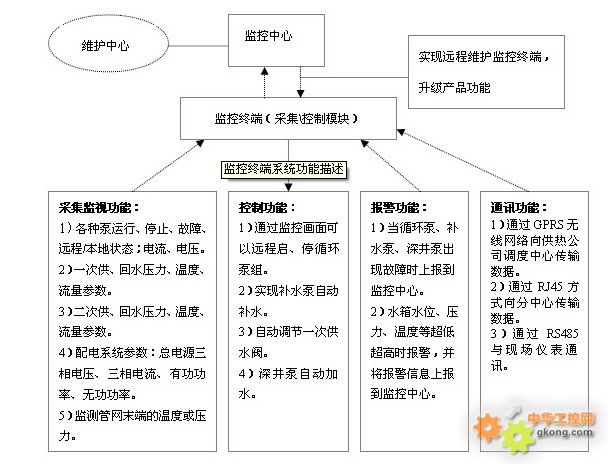三、監(jiān)控中心 3.1 公司調(diào)度監(jiān)控中心 監(jiān)控中心設(shè)立在供熱公司,充分利用其現(xiàn)有網(wǎng)絡(luò)資源及軟硬件設(shè)施,對(duì)其進(jìn)行完善,并增設(shè)服務(wù)器系統(tǒng)設(shè)備、工作站系統(tǒng)設(shè)備,建立統(tǒng)一的供熱實(shí)時(shí)監(jiān)控與管理系統(tǒng)。 3.1.1 系統(tǒng)組成 (1)中心機(jī)房信息匯集平臺(tái)系統(tǒng) 信息匯集平臺(tái)是系統(tǒng)數(shù)據(jù)通信、信息處理和服務(wù)的核心,主要由服務(wù)器系統(tǒng)、數(shù)據(jù)庫(kù)系統(tǒng)、通訊服務(wù)軟件、通信網(wǎng)絡(luò)系統(tǒng)等組成。 (2)工作站應(yīng)用系統(tǒng) 應(yīng)用系統(tǒng)是為工作人員提供相關(guān)信息的服務(wù)系統(tǒng),是整個(gè)系統(tǒng)的建設(shè)的目的,包括軟件系統(tǒng)、顯示系統(tǒng)配置、計(jì)算機(jī)配置及網(wǎng)絡(luò)的建設(shè)。 3.1.2 應(yīng)用軟件功能設(shè)計(jì) (1)采用B/S和C/S兩種結(jié)構(gòu)相結(jié)合:系統(tǒng)的設(shè)計(jì)是基于GPRS數(shù)據(jù)傳輸技術(shù)和網(wǎng)絡(luò)技術(shù)之上的,軟件開(kāi)發(fā)采用B/S和C/S兩種結(jié)構(gòu)相結(jié)合的方式設(shè)計(jì),同時(shí)支持Web訪問(wèn)、客戶端軟件訪問(wèn)模式設(shè)計(jì),方便不同職能部門(mén)的工作人員工作。 數(shù)據(jù)匯集處理和前端控制程序等應(yīng)用系統(tǒng)采用C/S體系結(jié)構(gòu)。監(jiān)控調(diào)度人員使用客戶端軟件訪問(wèn)系統(tǒng)完成所有操作,采用C/S體系結(jié)構(gòu)。其他非監(jiān)控類(lèi)人員使用瀏覽器訪問(wèn)系統(tǒng)完成所有操作,采用B/S體系結(jié)構(gòu)。 (2)實(shí)現(xiàn)對(duì)28個(gè)換熱站設(shè)備運(yùn)行情況、相關(guān)運(yùn)行參數(shù)的實(shí)時(shí)監(jiān)控,以及重要管網(wǎng)測(cè)點(diǎn)溫度、壓力數(shù)據(jù)的在線監(jiān)測(cè)。 (3)實(shí)現(xiàn)對(duì)全部數(shù)據(jù)的分析、存儲(chǔ)、預(yù)警與報(bào)表統(tǒng)計(jì)、曲線分析輸出功能。 (4)實(shí)現(xiàn)對(duì)測(cè)點(diǎn)各種機(jī)電設(shè)備設(shè)施情況、維護(hù)情況規(guī)范化建檔管理。 (5)實(shí)現(xiàn)系統(tǒng)權(quán)限管理、安全管理、日志記錄管理功能。 (6)電子地圖可視化界面顯示。 3.2 換熱站監(jiān)控中心 換熱站監(jiān)控中心設(shè)立泵站值班室,建立簡(jiǎn)易中心,為信息匯集平臺(tái)系統(tǒng)、應(yīng)用系統(tǒng)提供軟硬件技術(shù)支持。 換熱站監(jiān)控中心應(yīng)用軟件功能設(shè)計(jì)如下: (1)實(shí)現(xiàn)對(duì)無(wú)人值守?fù)Q熱站設(shè)備運(yùn)行情況、相關(guān)運(yùn)行參數(shù)的實(shí)時(shí)監(jiān)控。 (2)實(shí)現(xiàn)對(duì)全部數(shù)據(jù)的分析、存儲(chǔ)、預(yù)警與報(bào)表統(tǒng)計(jì)、曲線分析輸出功能。 (3)實(shí)現(xiàn)對(duì)測(cè)點(diǎn)各種機(jī)電設(shè)備設(shè)施情況、維護(hù)情況規(guī)范化建檔管理。 (4)實(shí)現(xiàn)系統(tǒng)權(quán)限管理、安全管理、日志記錄管理功能。 四、監(jiān)控終端系統(tǒng) 4.1 監(jiān)控終端系統(tǒng)構(gòu)成及功能框圖