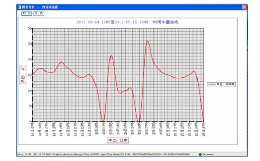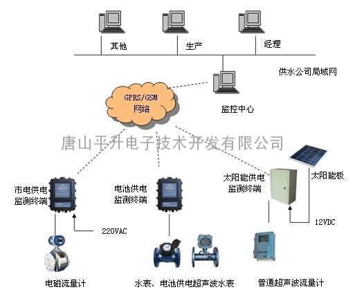 一、概述 分區(qū)計量管理,大用戶取水流量監(jiān)控系統(tǒng)適用于供水企業(yè)遠程監(jiān)測大客戶用水量和各區(qū)域用水量。調(diào)度人員和營業(yè)主管領(lǐng)導可以實時掌握大客戶和各區(qū)域的用水情況,以合理安排生產(chǎn),及時發(fā)現(xiàn)供水異常、減少管網(wǎng)漏損。 二、系統(tǒng)組成 分區(qū)計量管理,大用戶取水流量監(jiān)控系統(tǒng)主要由監(jiān)控中心、通信網(wǎng)絡(luò)、終端設(shè)備、計量表具等四部分組成。 ◆ 監(jiān)控中心: 主要硬件:服務(wù)器、客戶端、移動數(shù)據(jù)專線或GPRS數(shù)據(jù)傳輸模塊。 主要軟件:操作系統(tǒng)軟件、數(shù)據(jù)庫軟件、大客戶抄表及分區(qū)計量監(jiān)測管理系統(tǒng)軟件、防火墻軟件。 ◆ 通信網(wǎng)絡(luò):INTERNE公網(wǎng) + 中國移動公司GPRS網(wǎng)絡(luò)、移動專網(wǎng)、GSM網(wǎng)絡(luò)可選。 ◆ 終端設(shè)備:微功耗測控終端,市電供電、太陽能供電、電池供電可選。 ◆ 計量表具:傳統(tǒng)大口徑水表、發(fā)訊大口徑水表、普通流量計、電池供電流量計可選。 三、系統(tǒng)拓撲圖