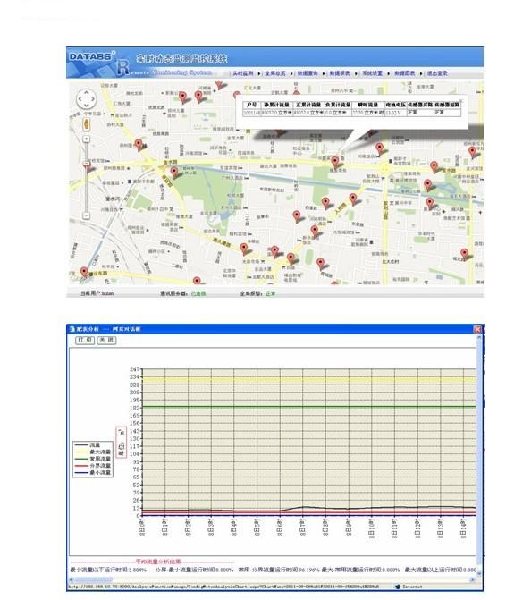 四、系統(tǒng)功能 ◆ 系統(tǒng)信息管理: 數(shù)據(jù)庫服務(wù)器參數(shù)設(shè)置、通信服務(wù)器信息設(shè)置、操作員信息管理、密碼修改、行業(yè)類別設(shè)置、系統(tǒng)公告信息管理。 ◆ 用戶基礎(chǔ)信息管理、區(qū)域信息管理、用戶信息管理、測點信息管理、表具信息管理。 ◆ 流量監(jiān)測管理: 水表最新數(shù)據(jù)監(jiān)測、水表數(shù)據(jù)補錄,監(jiān)測水表:瞬時流量、正累計流量、負累計流量。 ◆ 巡檢報修管理:水表巡檢管理、水表報修管理。 ◆ 數(shù)據(jù)查詢管理: 用戶信息查詢、測點信息查詢、用水情況查詢、報警信息查詢、操作日志查詢、歷史數(shù)據(jù)查詢。 ◆ 用水統(tǒng)計報表: 按小時、日、周、旬、月、年等時段生成報表,按年、月、日生成用水明細表。 ◆ 用水分析曲線:將區(qū)域、用水戶、水表的用水數(shù)據(jù)按小時、日、旬、月、年等時段曲線圖形。 ◆ 高級分析管理: 管損分析、配表分析、趨勢分析。 五、軟件界面展示