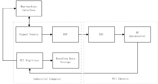 系統(tǒng)選用流水線形式進行連接,與信號流方向一致,具有很高的效率,時延短,處理數(shù)率高,可以一定程度上彌補GPP信號處理速度慢的不足。但是由于各模塊之間采用實際電路互聯(lián),模塊間耦合緊密,獨立程度不高。如果系統(tǒng)功能改變,需要增加、去除或修改某一模塊,牽扯到相應(yīng)的模塊變動,甚至總體結(jié)構(gòu)的改變。因為設(shè)計目的是針對測試系統(tǒng)信號源的測試和校準(zhǔn),信號相對固定,不需要頻繁變動,所以選用流水式結(jié)構(gòu),結(jié)構(gòu)框圖如圖2所示[7]。信號的產(chǎn)生和處理由工控機完成,任意波形發(fā)生模塊(Arbitrary Waveform Generator,AWG)實現(xiàn)波形輸出(高頻時需要用到數(shù)字上變頻卡),如果做無線發(fā)射和接收時需要附加天線和射頻放大器。信號的采集和數(shù)模轉(zhuǎn)換由凌華科技PCI-9846高速數(shù)字化儀完成,轉(zhuǎn)換結(jié)果可以實時顯示,也可以保存成波形文件以便后續(xù)處理。