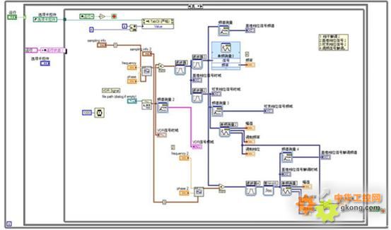 由于機器性能有限,程序分為產(chǎn)生、采集和處理三部分。根據(jù)信號建模的結(jié)果(參考“1.3 合成信號”),計算得出波形數(shù)據(jù)并保存到文件。在波形的產(chǎn)生程序中,先把波形數(shù)據(jù)讀出并寫入任意波形發(fā)生器,調(diào)用其產(chǎn)生所需要的信號。調(diào)用DAQPilot相關(guān)模塊控制數(shù)字化儀進行信號采集,并存儲到文件以便后續(xù)調(diào)用。解調(diào)程序調(diào)用此波形文件,進行相關(guān)解調(diào)及運算,完成信號分析。信號的產(chǎn)生與采集程序框圖如圖3所示,解調(diào)和運算程序框圖如圖4所示。