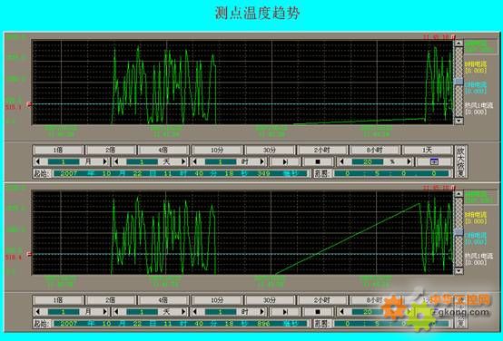 歷史趨勢(shì)的查詢是本系統(tǒng)的一個(gè)重要功能,通過歷史趨勢(shì)組件可以查詢各個(gè)電機(jī)電流以及多個(gè)測(cè)點(diǎn)溫度的變化趨勢(shì)。歷史趨勢(shì)可以查看任意時(shí)段的歷史數(shù)據(jù)、多個(gè)點(diǎn)可以顯示在一張圖表中,便于對(duì)比。