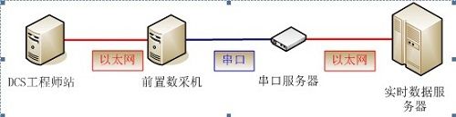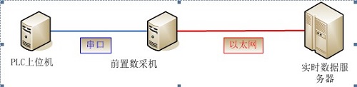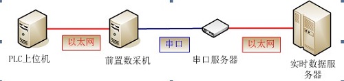 PLC上位機配置ModBus Server,前置數采機通過以太網ModBus驅動采集PLC上位機的數據,前置數采機和實時數據庫服務器之間通過串口通訊,為了延長通訊距離增加串口服務器。