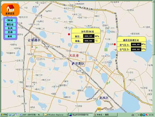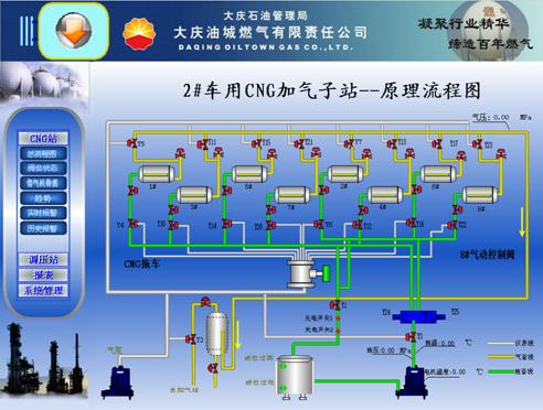 調壓站以RTU為核心組成的現場數據采集監控系統,通過GPRS的方式上傳給生產調度指揮中心。CNG子站通過ADSL和監控中心相連。調度中心通過人機界面系統完成對分布在全市范圍內的CNG加氣站和調壓箱實現數據通訊、全部生產數據監控采集。每天24小時不間斷地對各監控站的監測參數進行顯示并實現報警記錄、事件記錄以及主要的生產數據進行存儲與歸檔處理、報表輸出等管理功能。