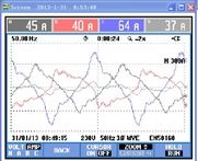 用FLUKE 434對照明回路進行測量得到電流波形如圖1所示。由圖可知,電流波形與理想的正弦波相去甚遠(yuǎn),畸變較為嚴(yán)重。電流波形的畸變會導(dǎo)致電壓波形的畸變進而影響到其他設(shè)備如計算機的正常運轉(zhuǎn)。同時N相電流達(dá)37A,電流不平衡問題也比較突出,存在較大的用電隱患。