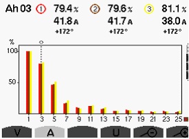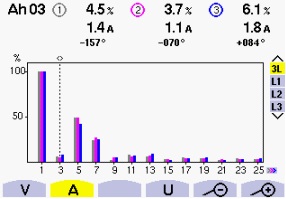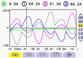 投入安裝ANAPF有源濾波器后LED屏控制開關柜進線側最大的總諧波電流含量降至51%,總諧波電壓畸變率降至3.1%,零線總諧波畸變率94.1%。3次諧波電流量A相1.4A、B相1.1A、C相1.8A、零線電流9.8A,含諧波功率因數提高至0.81。總諧波電壓畸變率THDu值降至3.3%。3次諧波電壓降至低于國標要求380V低壓側諧波電壓奇次畸變率THD≤4%的要求。 由上圖對比可見,ANAPF有源濾波器保護了LED供電系統(tǒng)安全、穩(wěn)定、經濟運行,防止過電流速斷保護的誤動作,有利于電網和系統(tǒng)的安全穩(wěn)定運行。