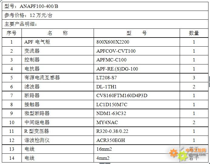 說明: 1、可以通過實測數(shù)據(jù)確定補(bǔ)償電流,或通過電力系統(tǒng)詳細(xì)信息(單線圖、變壓器、負(fù)荷情況等)計算出補(bǔ)償電流; 2、三線系統(tǒng)需配置2個或3個CT(用于A相和C相),四線系統(tǒng)需要配置3個CT(用于A相、B相和C相)。 2.2 ANAPF有源濾波器報價及元件清單