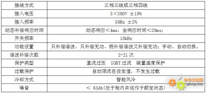 13波補(bǔ)償前電流頻譜圖 13波補(bǔ)償后電流頻譜圖 1.5治理效果 在10kV母線4段和5段使用兩套有源電力濾波器裝置進(jìn)行治理后,系統(tǒng)諧波得到了很好的抑制,完全將11次、13次諧波限制在國家標(biāo)準(zhǔn)的范圍內(nèi),提升供電系統(tǒng)的供電可靠性,消除了系統(tǒng)諧波對電網(wǎng)系統(tǒng)影響的隱患,收到了良好效果,達(dá)到改善電網(wǎng)電能質(zhì)量的目的。 2、ANAPF有源濾波器簡介 2.1技術(shù)參數(shù)
