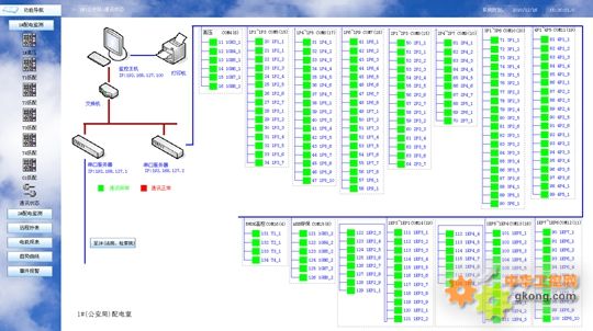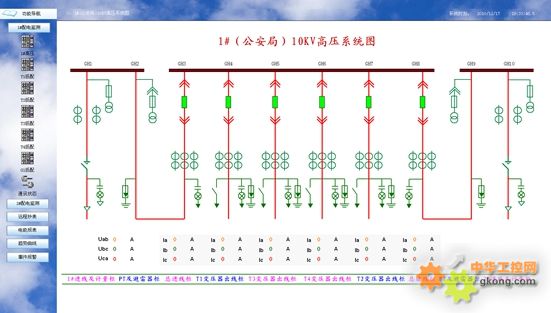 進入系統(tǒng)后通過遙測我們可以查看各回路的三相線電壓、電流、功率、電能等電參量。遙信功能則實現(xiàn)了顯示現(xiàn)場設備的運行狀態(tài),主要包括:開關的分、合閘運行狀態(tài)和通訊故障報警,斷路器變位時會發(fā)出報警信號。如下圖2,高壓配電系統(tǒng)主要監(jiān)測了高壓回路的運行狀態(tài),紅色代表合閘,綠色代表分閘;并在畫面上動態(tài)顯示三相電流、線電壓。
