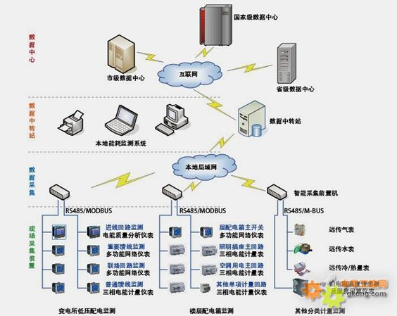 1、數(shù)據(jù)采集層:通過安裝在能耗監(jiān)測(cè)儀表箱(柜)中的帶數(shù)字接口的智能電力儀表,實(shí)施對(duì)負(fù)荷用電量的實(shí)時(shí)監(jiān)測(cè)。監(jiān)測(cè)數(shù)據(jù)包括:電壓、電流、有功功率、無(wú)功功率、功率因數(shù)、有功無(wú)功電能、諧波、環(huán)境與開關(guān)狀態(tài)、事件記錄等用電參數(shù)。監(jiān)測(cè)對(duì)象包括:電力需求側(cè)中低壓饋線回路、主要耗能機(jī)電設(shè)備、廠房(生活區(qū))其他耗能設(shè)施。同時(shí)也可以對(duì)用水量、用氣量、熱量、投料量、產(chǎn)量等,通過電子式流量表、電子式熱量表、電子皮帶秤、地秤等現(xiàn)場(chǎng)智能數(shù)據(jù)采集,根據(jù)現(xiàn)場(chǎng)條件和系統(tǒng)應(yīng)用的要求,采集的數(shù)據(jù)也可以取自用戶的其他智能系統(tǒng)的數(shù)據(jù)接口。