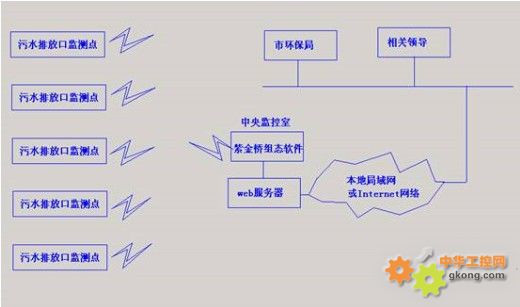 將污水的監(jiān)測連續(xù)化、自動化、計算機化,使環(huán)保部門可準確、及時、完整地掌握污染源排放的實際情況和變化規(guī)律。對因突發(fā)事故造成的損失亦可及時發(fā)現(xiàn),加強各市環(huán)保局對本地區(qū)污水排放的管理和控制,有效地減少環(huán)境污染。其結(jié)構(gòu)圖如下: