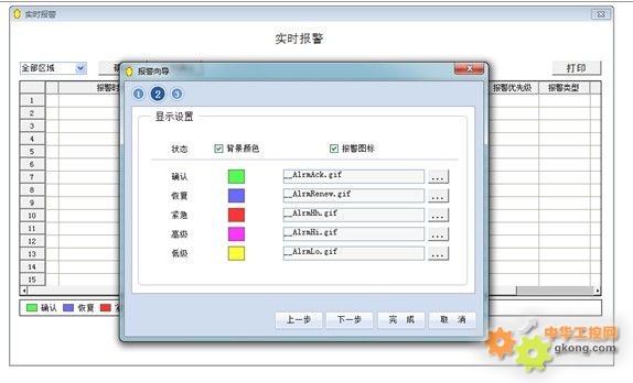 第2步為顯示設置,可以設置每一條報警記錄的背景顏色和報警圖標。背景顏色只顯示在“報警確認”和“報警優先級”2個字段中。如果選擇顯示報警圖標,則圖標顯示在每條記錄的第1列,否則不顯示圖標。如下圖所示: