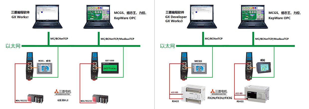 4、支持三菱編程軟件GX Works2、GX Developer的以太網通訊。