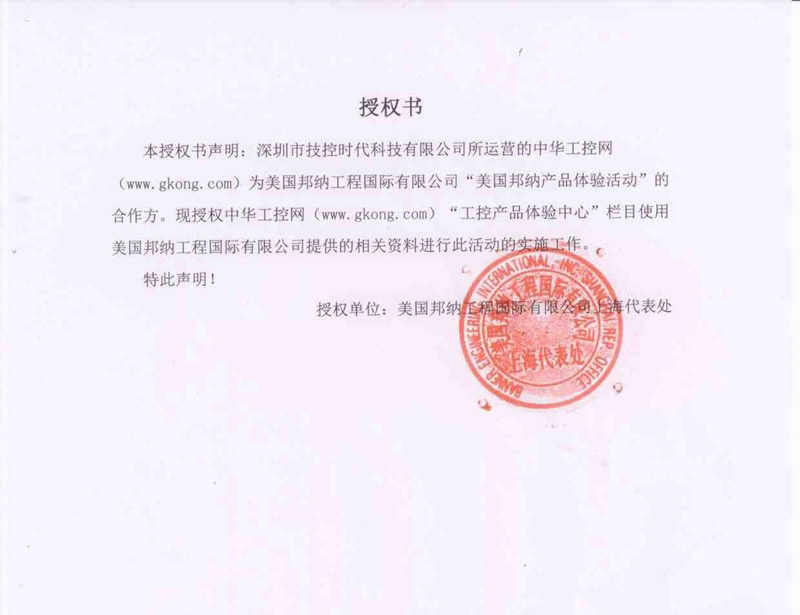 本授權書聲明:深圳市技控時代科技有限公司所運營的中華工控網(m.moduwu.com)為美國邦納工程國際有限公司“美國邦納產品體驗活動”的合作方?,F授權中華工控網(m.moduwu.com)“工控產品體驗中心”欄目使用美國邦納工程國際有限公司提供的相關資料進行此活動的實施工作。
