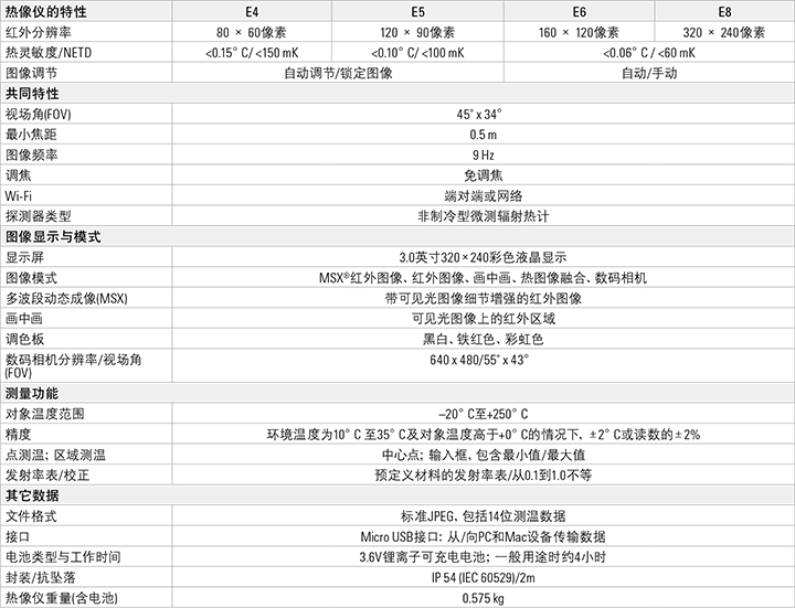 FLIR E4、E5、E6和E8紅外熱像儀功能強大、簡單易用且價格極 為經濟實惠,是建筑、電氣和機械應用領域的理想故障排除工具。 提供四種分辨率供選(從80×60到320×240紅外像素),可滿足您 對目標尺寸、工作距離和細節的所有需求。這幾款熱像儀均采用 MSX ? 技術,可提供非同一般的熱成像細節。具有Wi-Fi連接功能, 能通過FLIR Tools移動應用程序連接至智能手機和平板電腦,可從 任意地點輕松地分享圖像、發送報告,便于您更迅速地作出關鍵決 策。Ex系列熱像儀通過提供熱圖像助您發現隱藏的問題、獲得精 確的溫度測量結果,是老式紅外測溫儀理想、劃算的替代產品。