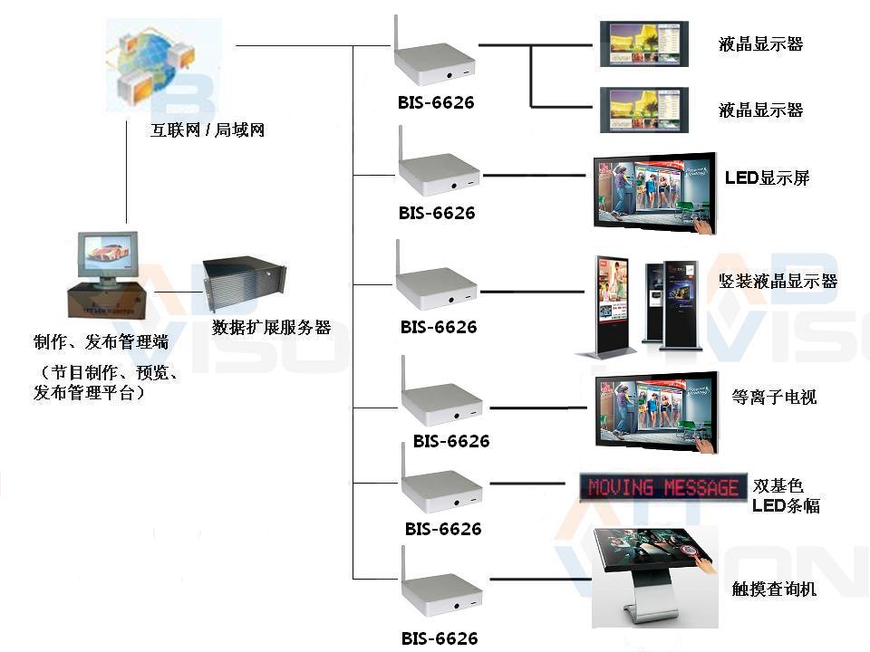 客戶選擇了華北工控一款ARM架構的盒式電腦(BIS-6626)作為該數字標牌系統的高清播放終端,配合系統專用的播放軟件,實現柜臺和店內大廳的所有LED顯示屏和高清多媒體廣告屏上的顯示內容實時同步,主要包括三大區域的系統配置: