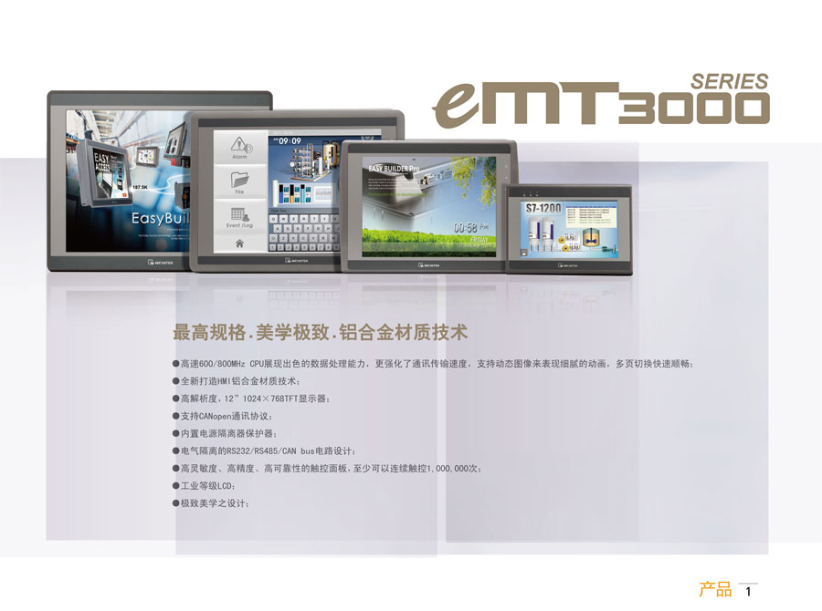 威綸通eMT觸摸屏,不只是一個(gè)顯示的觸摸屏,她更是一個(gè)現(xiàn)場(chǎng)的智能終端,讓自動(dòng)化機(jī)器設(shè)備變得智能、靈活;她可以實(shí)現(xiàn)遠(yuǎn)程監(jiān)控、遠(yuǎn)程數(shù)據(jù)推送&拉取(同步)、遠(yuǎn)程打印、遠(yuǎn)程診斷…它是物聯(lián)網(wǎng)云應(yīng)用的智能節(jié)點(diǎn);實(shí)現(xiàn)以往特殊設(shè)備或PLC才能實(shí)現(xiàn)的功能,可以成為現(xiàn)場(chǎng)生產(chǎn)的監(jiān)控中心,帶來(lái)用戶(hù)生產(chǎn)模式的改變,成為國(guó)內(nèi)OEM廠商提升產(chǎn)品檔次與競(jìng)爭(zhēng)力的有力依托。