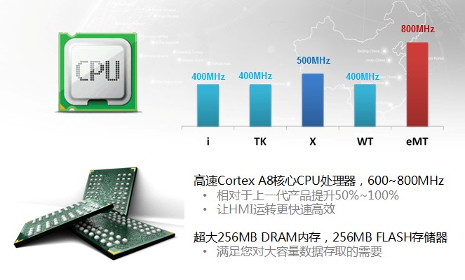 eMT的三大件全部進(jìn)行了翻倍的升級(jí),實(shí)驗(yàn)對(duì)比標(biāo)明,eMT3000在整數(shù)運(yùn)算、FLASH讀寫(xiě), Jpeg圖片的顯示與切換等方面相對(duì)以往具有很大的優(yōu)勢(shì)。