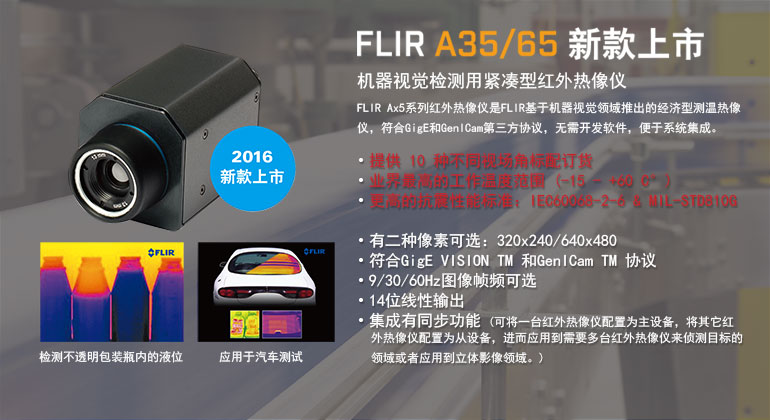 | FLIR Ax5系列熱成像溫度探測(cè)器提供全方位的可視化溫度監(jiān)控功能,廣泛應(yīng)用于過程控制/質(zhì)量檢測(cè)、狀態(tài)監(jiān)控與火災(zāi)預(yù)防等領(lǐng)域。A35與A65可無縫集成于現(xiàn)有系統(tǒng)中,是市場(chǎng)上唯一一款能通過GenICam?軟件提供溫度線性輸出能力的熱成像溫度傳感器。點(diǎn)擊此處,了解更多 | ||||